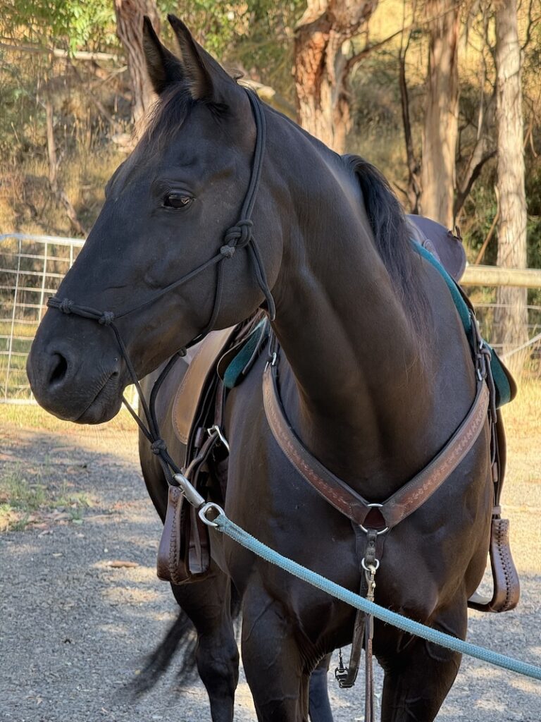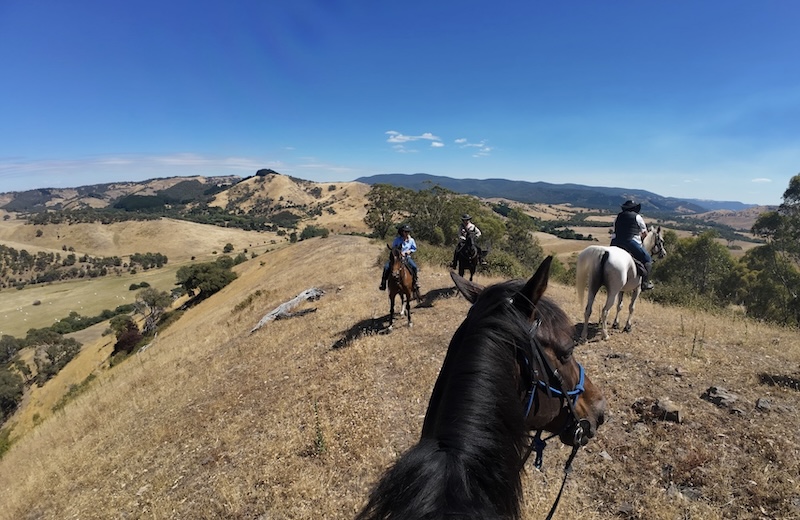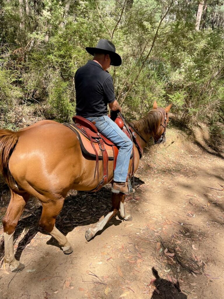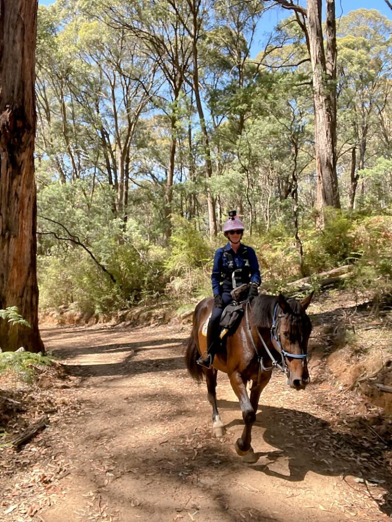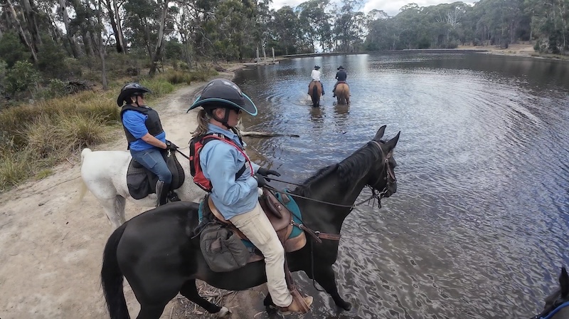 January Club ride was, for a short period, under threat of cancellation. Victoria was gripped in catastrophic fire danger just the week before – indeed, still had fires burning. Victoria also had flash flooding the day before, with cars swept out to sea. Mother Nature has plenty of power to wield! We were lucky enough to see the softer side, with days of 28 and 26 degrees, blue skies, sunshine, no wind – perfect. As is often the case, January was lighter on for riders, with school holidays still in full swing and members being away. Brian, Kaye, Lou and I arrived throughout Friday afternoon/evening, spending a quiet evening with a few (too many) drinks and dinner. We were up and ready to go by just after nine, with Michelle meeting us at the clubhouse before we floated up to Army Road to unload. Sammie made it just as we were wishing we had reception to see where she was, and we all headed out just after 10.30. . Although it was warm, the Tallarook State Forest provides plenty of shade. Recent winds saw plenty of tree debris across the tracks, but the washouts didn’t seem as bad as in previous rides. Lou’s Sally had picked Brian’s Sunday as her new best friend and gave the other ponies fair warning before we’d headed off. Idaho wasn’t feeling the love at all and made sure he kept plenty of paces ahead most of the way there. It was a different ride for me in that he was much more forward, although racing down some of the hills caused him to lose his footing once or twice! Such a wuss, my pony, scared of a cute little mare! We all enjoyed a lovely ride to the reservoir, and it was warm enough for a swim before lunch. Sammie had stripped her horse of his saddle and was out of her joddy’s before we’d finished giving the horses a drink. I was the only other one silly enough to strip down to my bonds cottons and took Idaho in with Chase (maybe it was a boy thing!) Thankfully there were no campers for a change, so no one other than members were scarred! The water was refreshing as it had become quite a warm day and I’m sure the boys enjoyed the cool off. Chase could have shown his appreciation for the swim by being nice to his mum, but was totally inconsiderate as poor Sammie tried to get back into her joddy’s. He really didn’t think of all of us with cameras either, as none of us were prepared to snap away when he chose to roll while Sammies jods were only halfway up. Cries of “don’t roll, don’t roll, don’t roll….arghhhh” with poor Sammie trying to stop him, hold her pants and save her dignity would have been a priceless video. We would have shared it (or not, for a price!) Imagine!